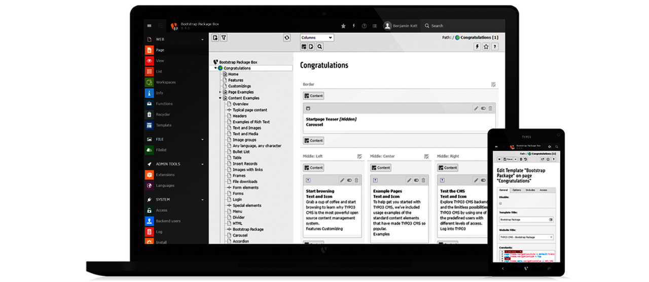 The administration interface, called TYPO3 Backend, can be managed from any modern web browser, including tablets and smart phones the same way. Publishing a small change on-the-go or working with tablet devices to add content has never been easier.